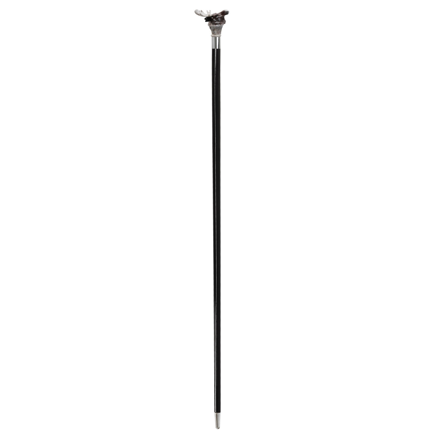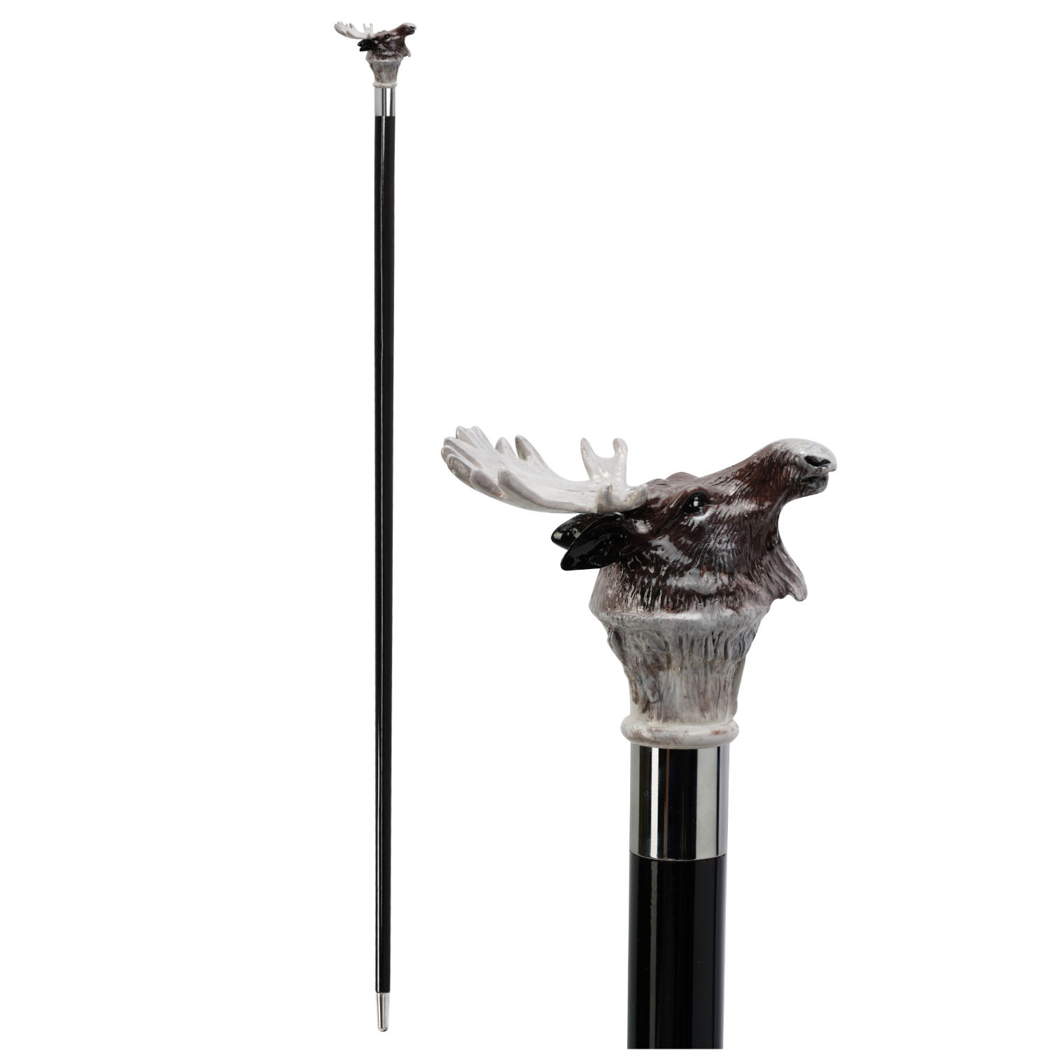 Elegante bastone da passeggio con testa di alce scolpita e dipinta a mano sull'impugnatura.