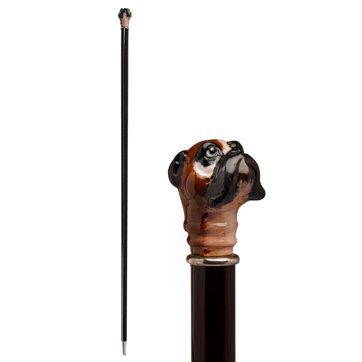 Elegante bastone da passeggio stile "British Country" con fascia placcata argento 925 e impugnatura modellata e dipinta a mano raffigurante un cane di razza Carlino.