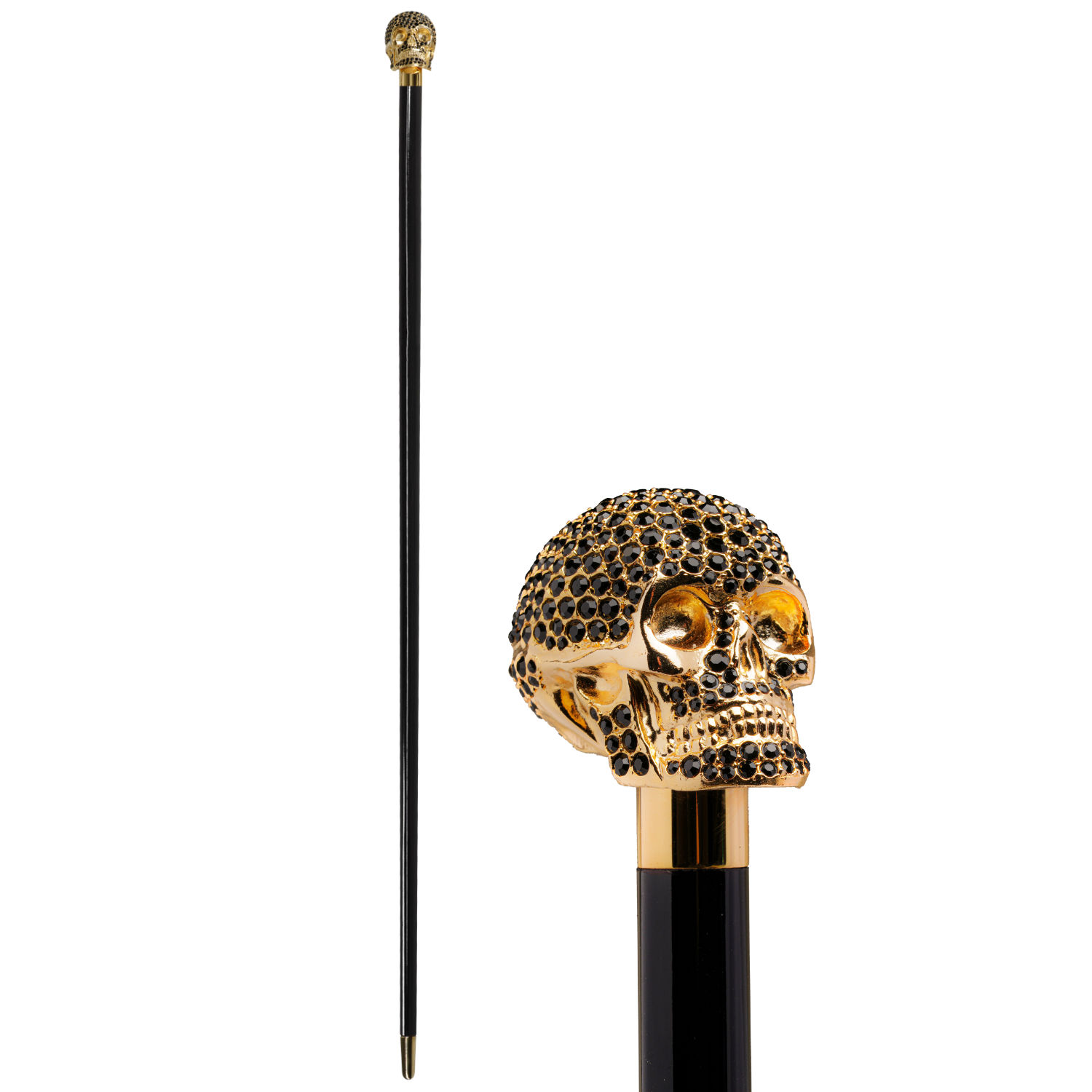 Lussuoso bastone da passeggio elegante con originale impugnatura teschio placcata oro 24k e ricoperta di preziosi Swarovski neri.
