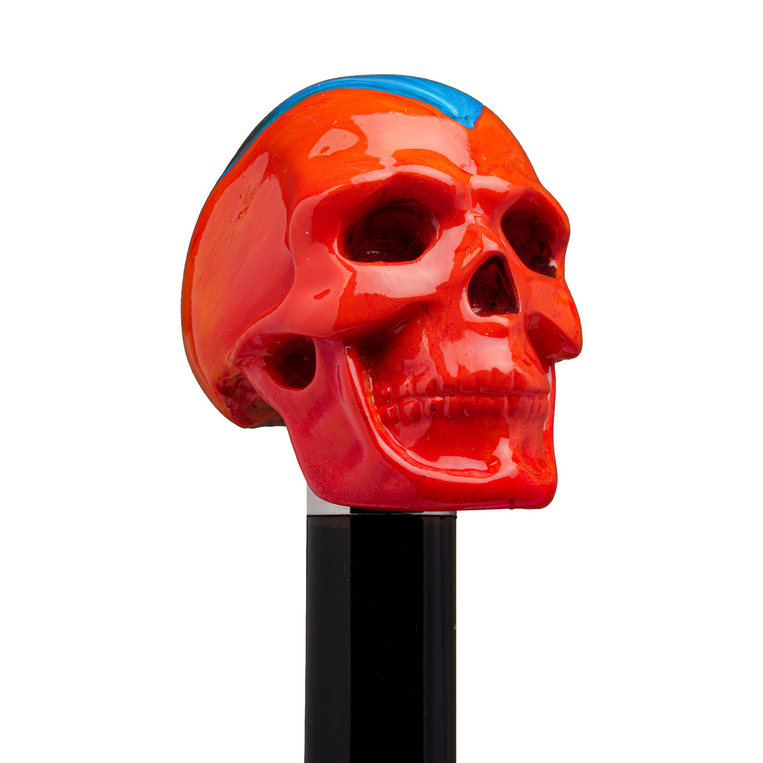 Raffinato bastone da passeggio con teschio rosso e azzurro azzurro scolpita e dipinta a mano sull'impugnatura.