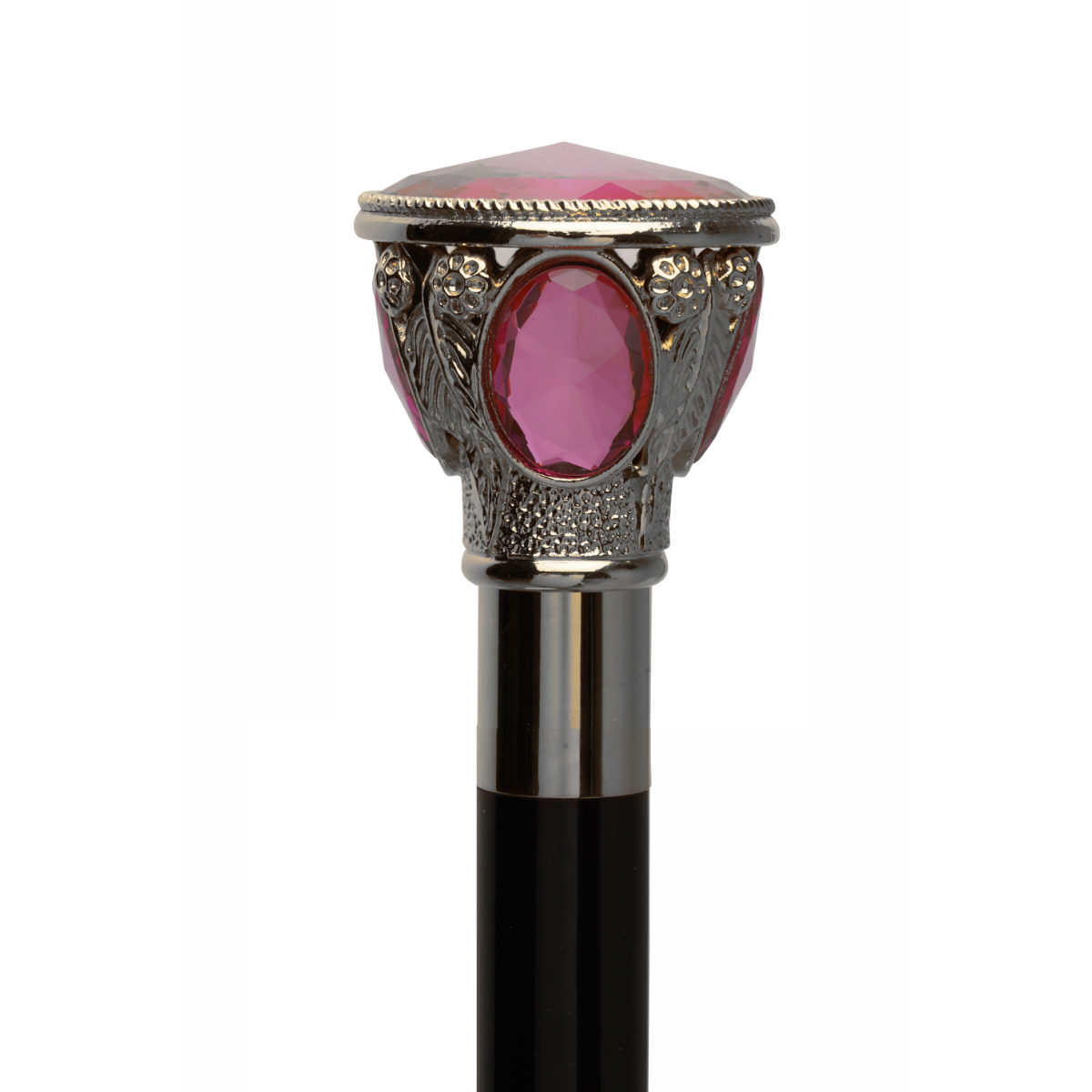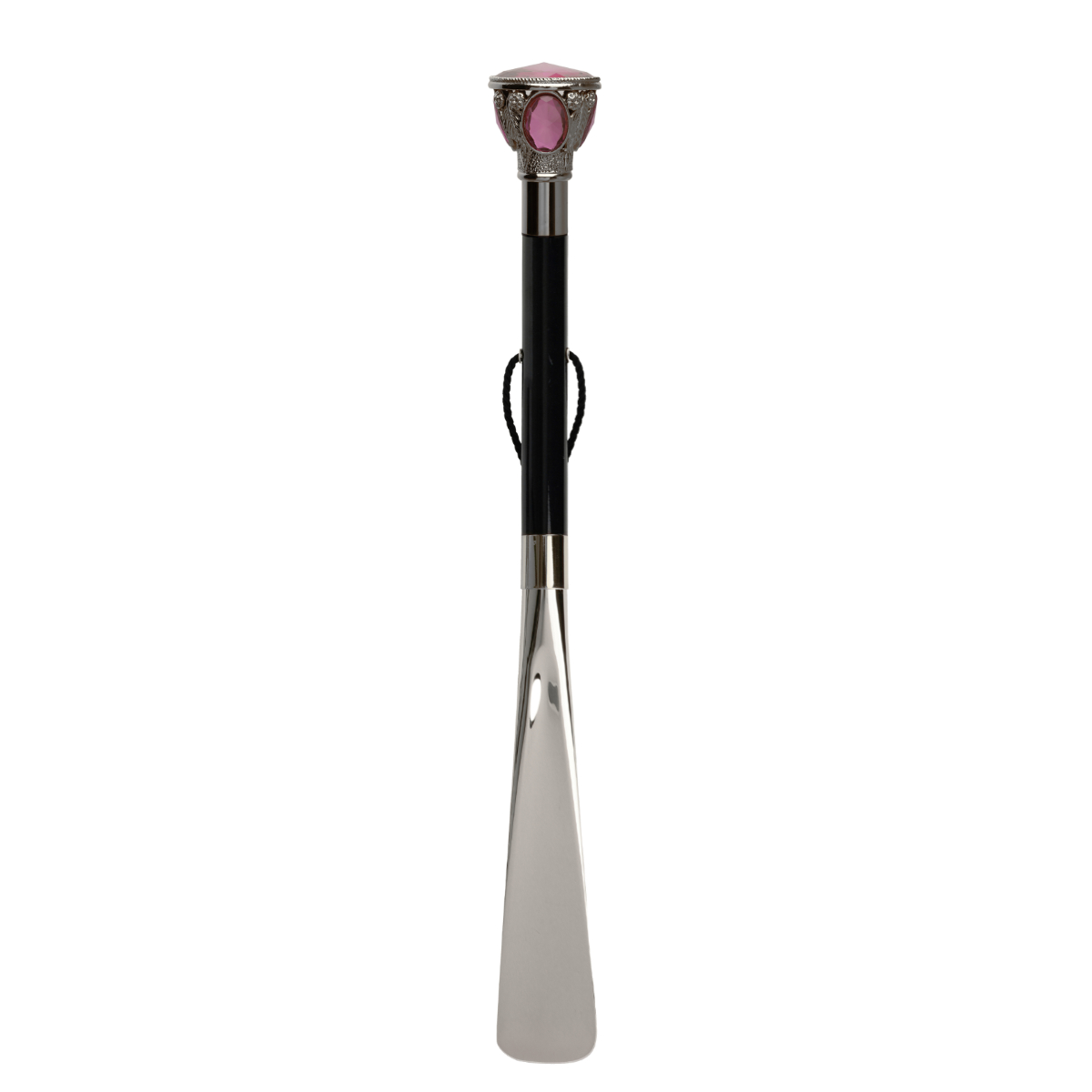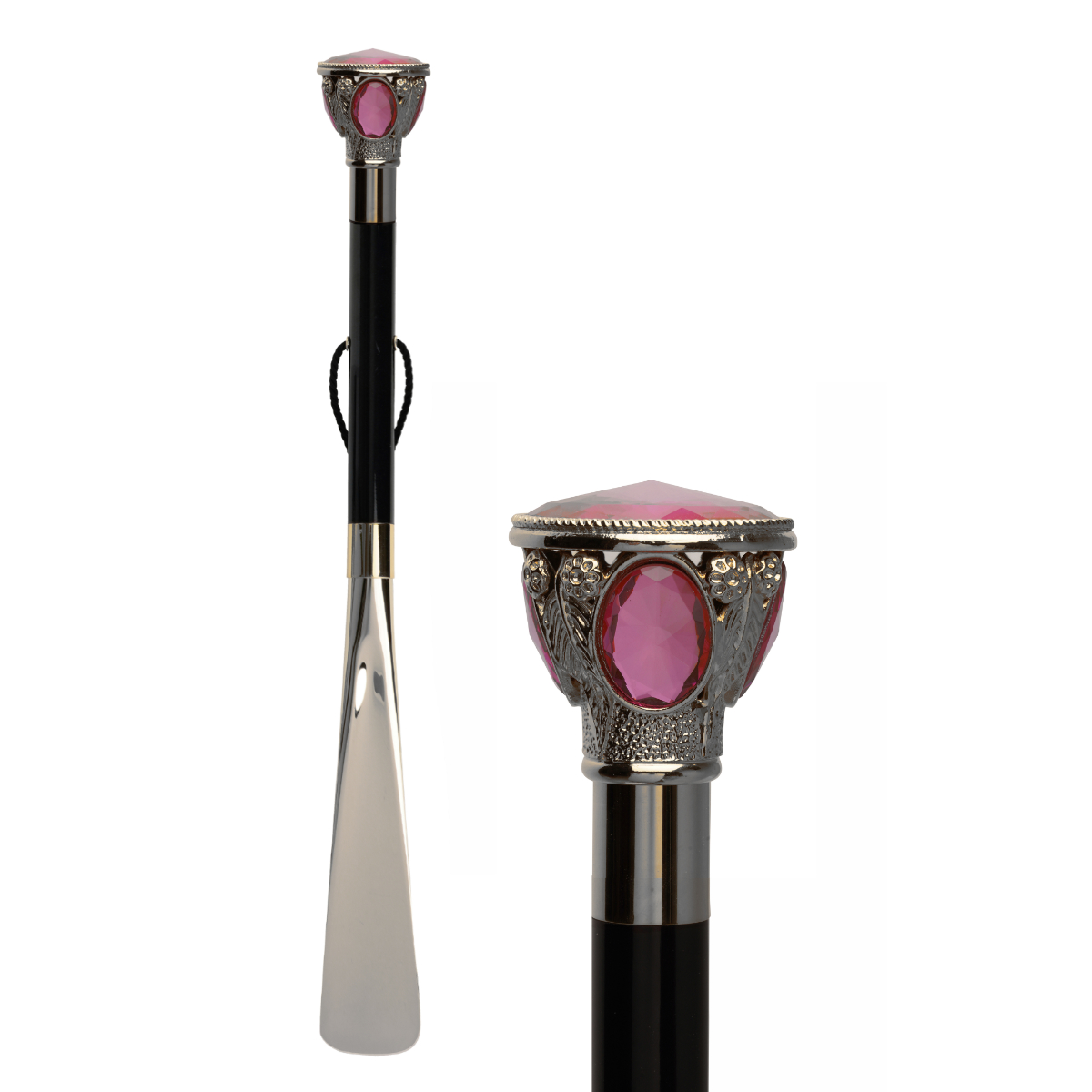 Prezioso calzascarpe con asta lunga, impugnatura finemente decorata con pomello placcato argento 925 e cabochon Swarovski magenta.