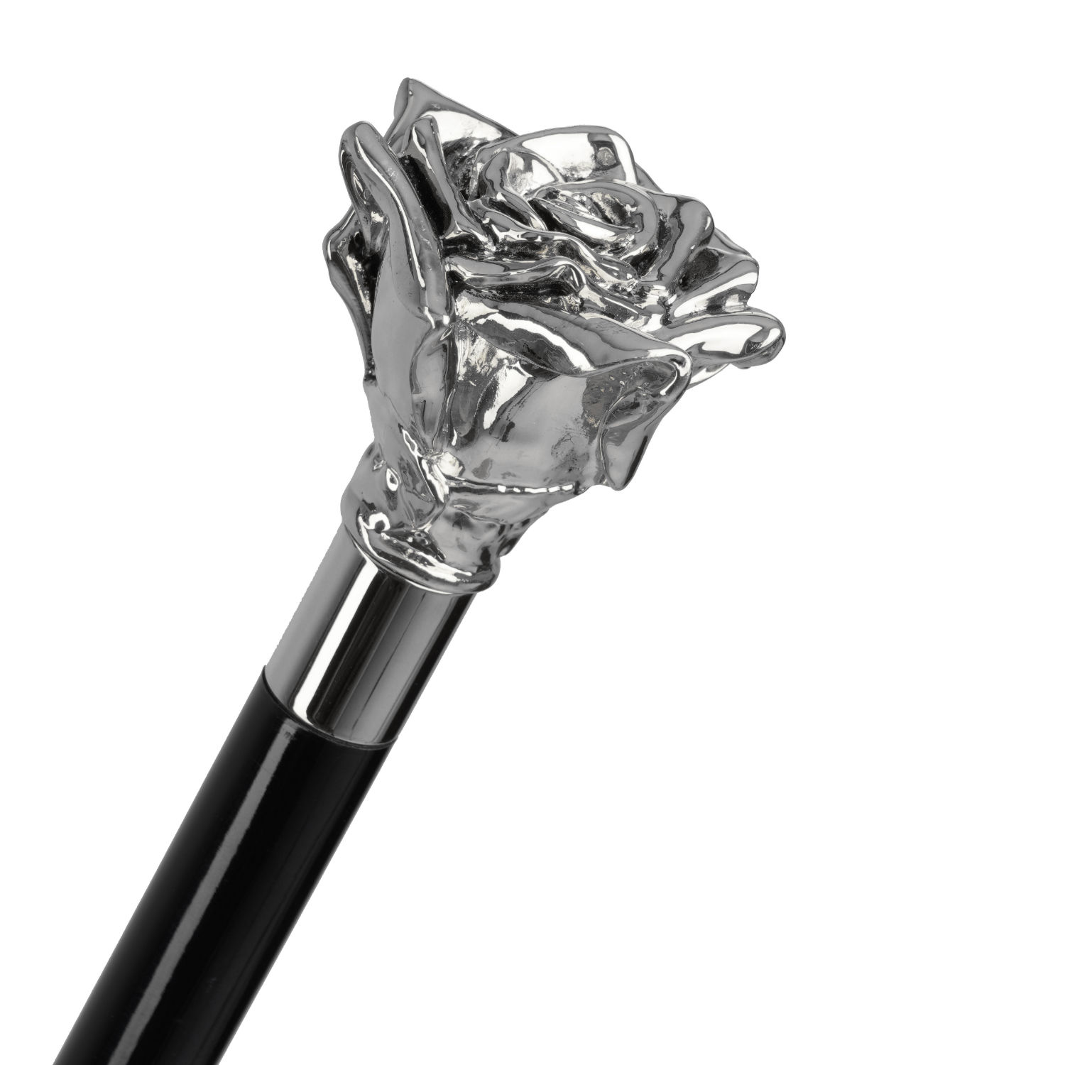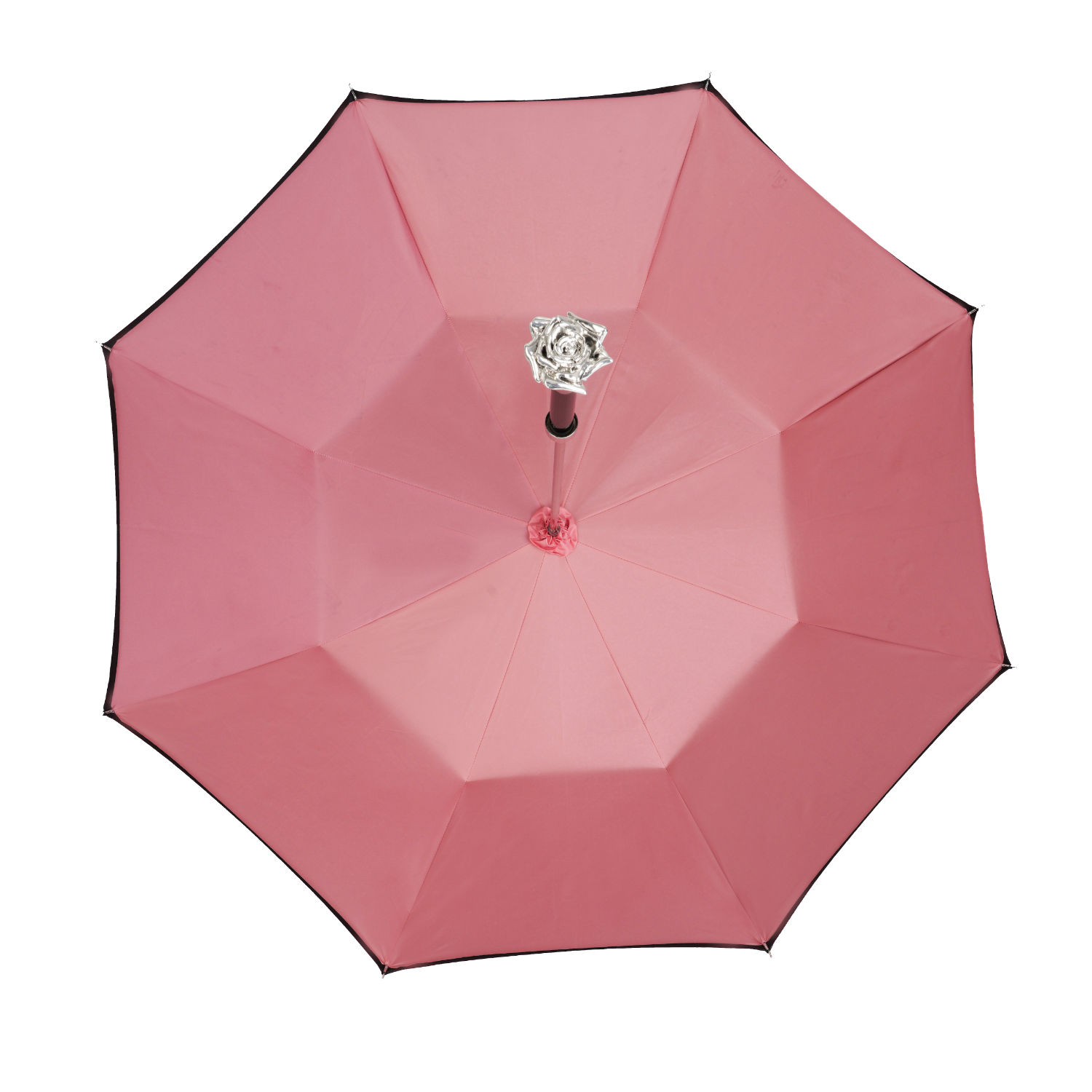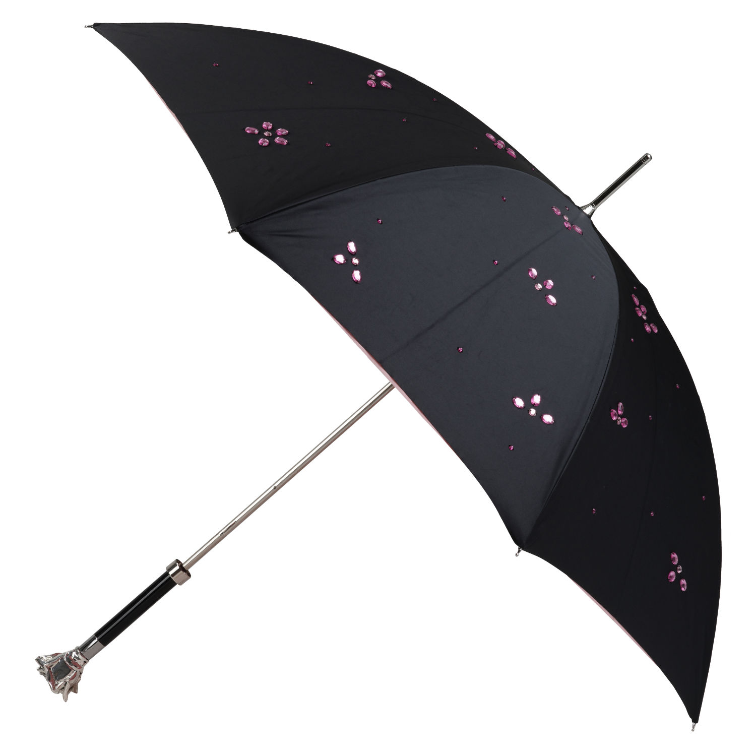 Elegante ombrello da donna com impugnatura goiello personalizzata con rosa modellata a mano e placcata argento 925, telo double face esterno nero e interno rosa con preziose applicazioni Swarovski.